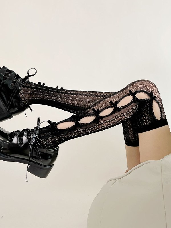 Calcetines altos hasta el muslo con encaje recortado y adorno de lazo