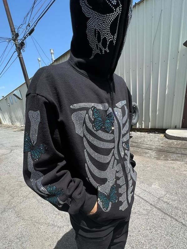 Sudadera con capucha extragrande con diamantes de imitación y mariposa esqueleto para hombre