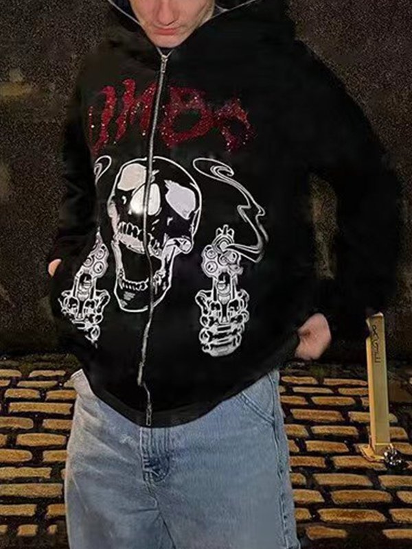 Sudadera con capucha negra con cremallera y calavera con letra de diamantes de imitación para hombre