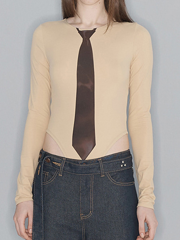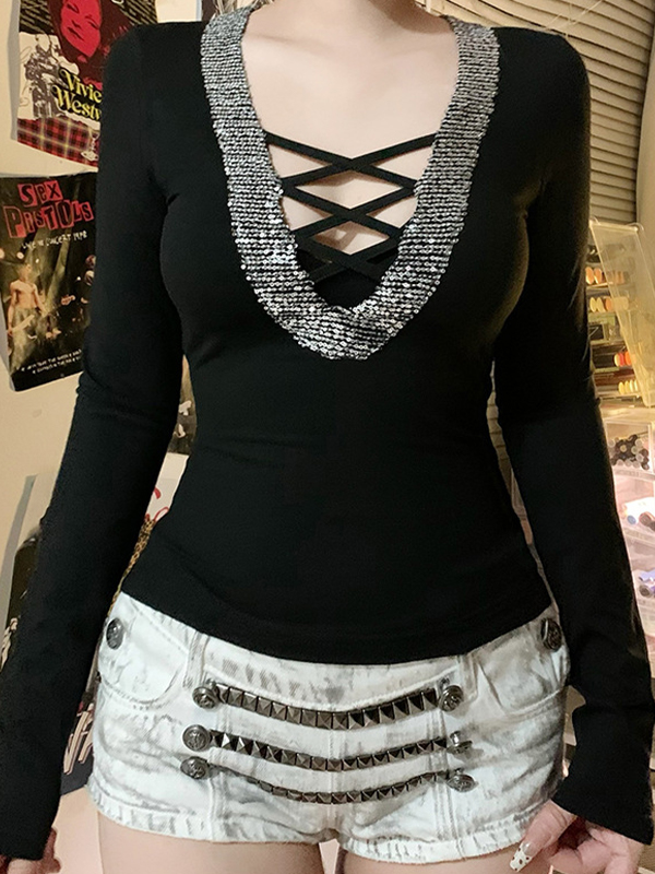 Camiseta de manga larga hueca con cuello en V y lazo