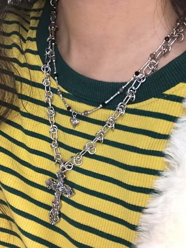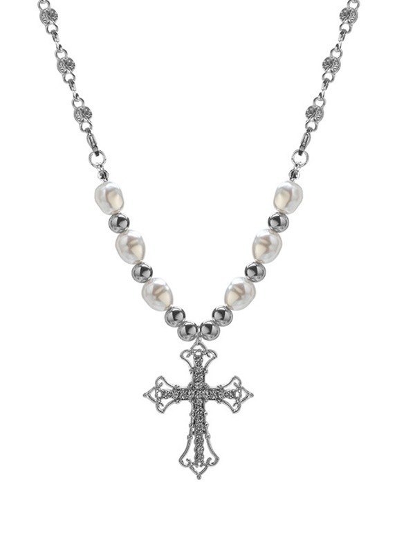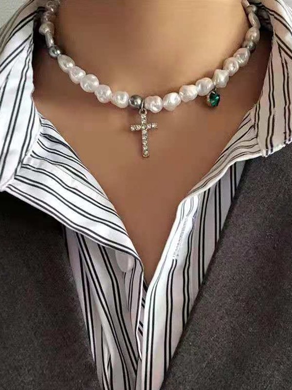 Collar de gargantilla de perlas de imitación con colgante de cruz de diamantes de imitación