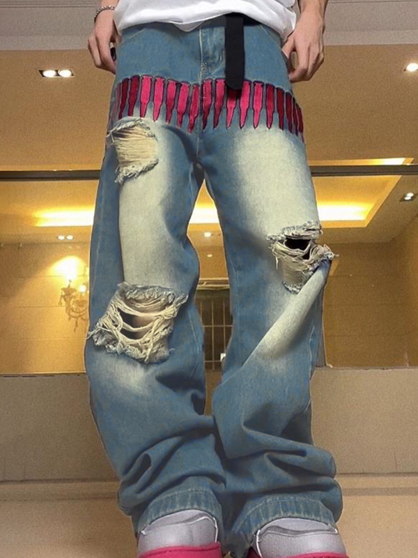 Vaqueros holgados rasgados con bordado de balas de hombre de color rosa