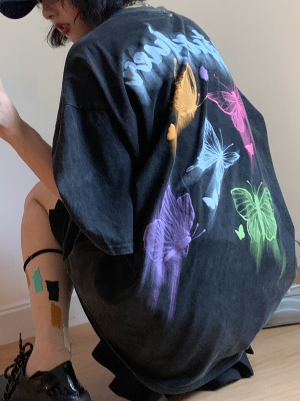 Camiseta de manga corta de gran tamaño con mariposa y grafiti vintage