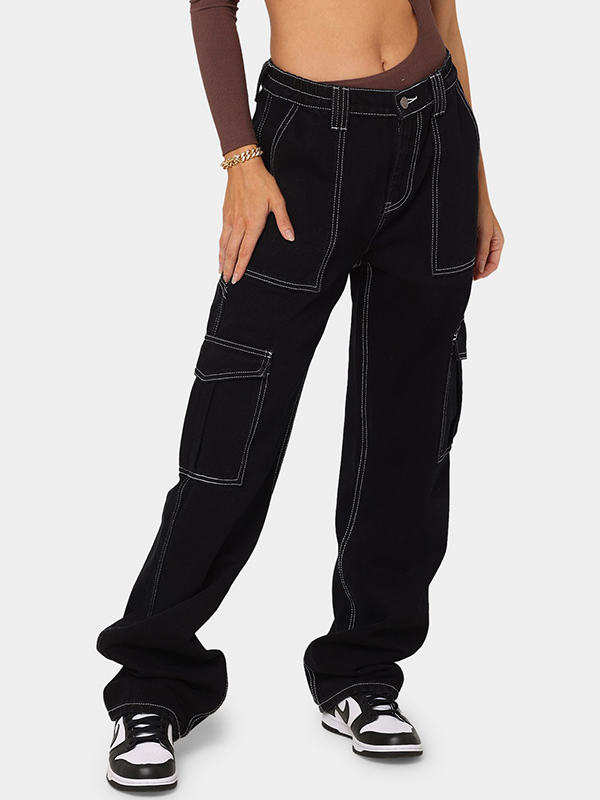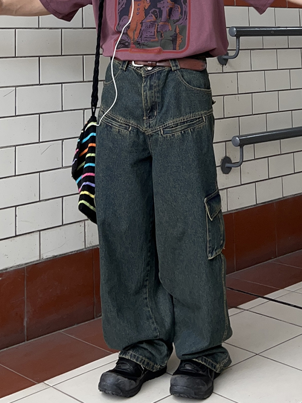 Jeans de trabajo con múltiples bolsillos, lavados y desgastados, estilo retro