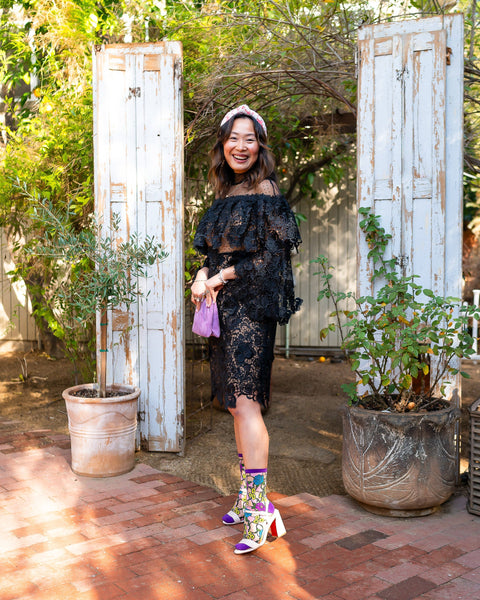 Inspirée de La Belle et la Bête, notre chaussette transparente à motif floral Vitrail présente des fleurs violettes, jaunes et bleues, ainsi que des pièces roses abstraites qui créent l’illusion du vitrail. Talon, pointe et revers violets pour une touche d’élégance et de féminité. Taille unique. Convient aux pointures femme américaines 5,5 à 10. 200 aiguilles. Originale et élégante, sans motifs enfantins. Qualité supérieure, confectionnée avec un tissu extensible et confortable. Unique, l’accessoire parfait pour affirmer votre personnalité.