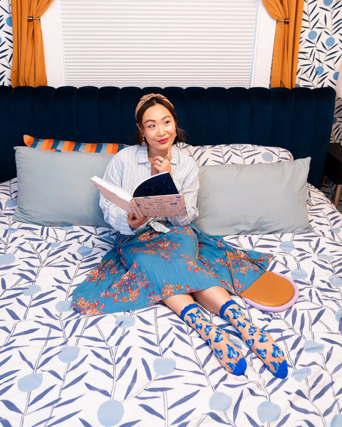 Avis aux amatrices de myrtilles ! Nos chaussettes transparentes à volants « Myrtilles » arborent un imprimé intégral de myrtilles dans différentes nuances de bleu sur un tissu beige transparent. Nous avons sublimé le motif par un dégradé subtil sur les myrtilles, créant ainsi un effet de relief. Une bordure à volants bleus apporte une touche féminine. Ces chaussettes sont l’accessoire idéal pour vos tenues printanières. Taille unique. Convient aux pointures 36 à 41 (pointures américaines femme). 200 aiguilles. Un style original et élégant, sans motifs enfantins ni ridicules. Qualité supérieure, confection durable et extensible pour un confort optimal. Unique : l’accessoire parfait pour affirmer votre personnalité.