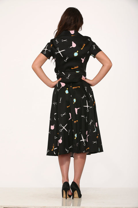 Faites sensation avec l’ensemble Orchid Bloom Black Beauty Salon Top&Skirt, un clin d’œil ludique à l’élégance vintage des salons de coiffure. Cet ensemble charmant se compose d’un haut boutonné à manches courtes et d’une jupe longue assortie, ornés d’imprimés fantaisistes sur le thème des salons de coiffure : ciseaux, sèche-cheveux et peignes dans des tons pastel roses et bleus qui contrastent avec le fond noir profond. Le mélange coton-élasthanne assure une coupe flatteuse et légèrement extensible, tandis que la fermeture éclair au dos et les poches latérales offrent style et praticité. Parfait pour affirmer votre style en toutes circonstances !