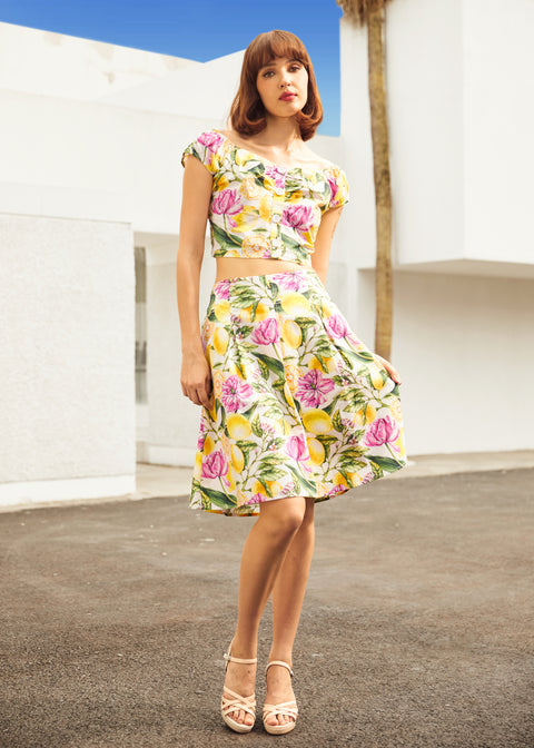 Doux, structuré et parfait pour les beaux jours, le top « The Zest Is Yet to Come » de notre marque ModCloth est un véritable rêve d’agrumes. Orné d’un imprimé floral citronné audacieux, ce petit haut court séduit par ses manches courtes, son décolleté en cœur et sa fermeture boutonnée sur le devant. Le dos smocké offre une coupe confortable et flexible, idéale à associer à la jupe assortie ou à porter seul pour une touche rétro rafraîchissante.