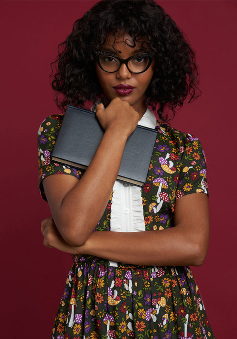 En hommage à notre logo original, nous vous présentons avec émotion un nouveau motif dessiné à la main représentant un sol forestier d’un vert mousse luxuriant, parsemé d’adorables champignons de Paris aux chapeaux rouges, jaunes et violets, entourés de fleurs joyeuses et de petits coléoptères. Confectionnée dans un tissu léger, cette ravissante robe cintrée et évasée se distingue par son col pointu blanc contrastant et sa patte de boutonnage ornée de volants au niveau du corsage. Avec ses manches courtes et sa ceinture assortie et amovible à la taille froncée, qui souligne une jupe évasée au-dessus du genou dotée de poches latérales pratiques, cette mini-robe d’inspiration années 70 est un véritable coup de cœur.