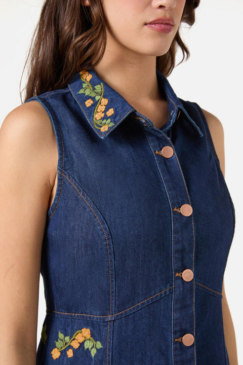 Dites bonjour à votre nouvelle robe en denim de rêve. La robe brodée Flower Child insuffle un esprit groovy des années 70 à une silhouette mini moderne, avec de jolis motifs floraux rétro brodés sur un denim de coton classique. C’est la pièce parfaite à enfiler en un clin d’œil pour des journées insouciantes et des superpositions décontractées.