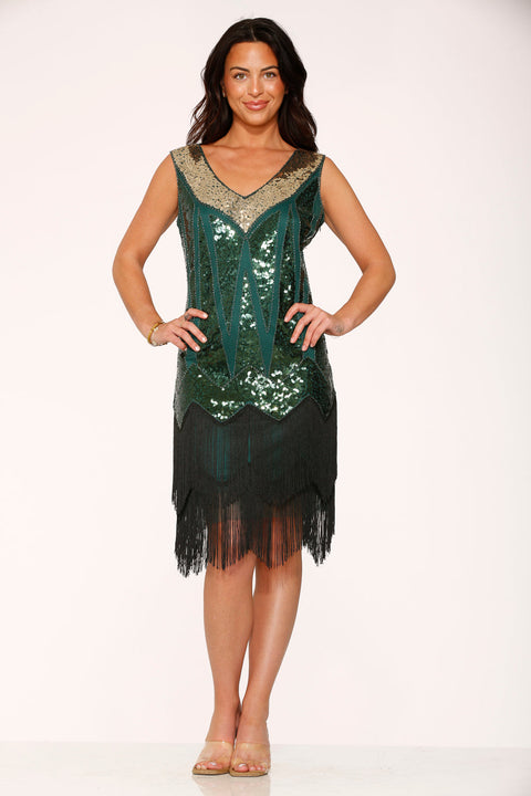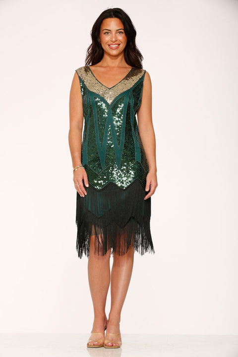Illuminez la piste de danse dans cette robe Charleston vert émeraude éclatante signée Orchid Bloom. Ornée de sequins scintillants, d’un décolleté rehaussé de détails dorés et de franges superposées pour un mouvement fluide, cette pièce d’inspiration vintage apporte une touche glamour Gatsby à toutes vos soirées.