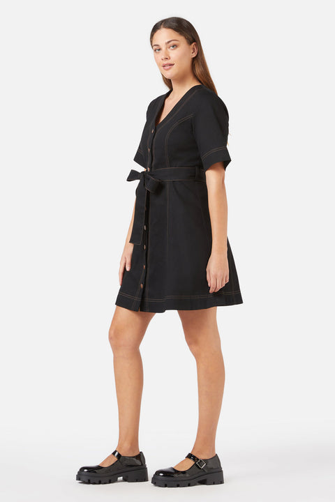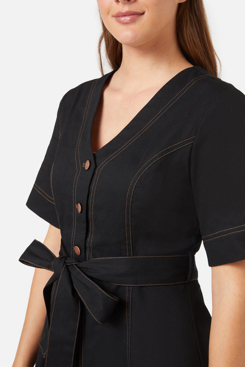 Robe Tiana Mini de Princess Highway : Adoptez un style décontracté chic avec la robe Tiana Mini en denim noir. Cette robe courte évasée est confectionnée en sergé de coton résistant pour un confort optimal au quotidien. Dotée d’un décolleté en V, d’une fermeture boutonnée sur le devant et de manches courtes flatteuses, elle est agrémentée de surpiqûres contrastantes beiges et d’une ceinture amovible pour une touche rétro. Parfaite pour une journée décontractée ou une soirée, cette robe allie aisance et style avec brio.