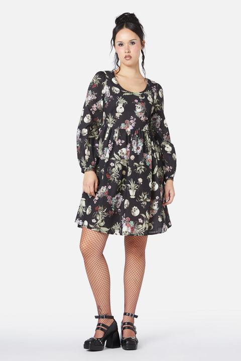 Plongez dans un univers où le fantaisiste et le gothique s’entremêlent avec malice grâce à la robe imprimée de Dangerfield. Cette pièce unique met en valeur l’œuvre captivante « Memento Mori », une invitation à chérir chaque instant, vous enveloppant d’un récit aussi ancien que le temps, tandis que vous affichez une allure résolument moderne. Sa coupe classique cintrée et évasée souligne la taille et s’évase avec fluidité autour de vos jambes, offrant une silhouette à la fois flatteuse et espiègle. Les manches longues et bouffantes ajoutent une touche théâtrale, parfaites pour gesticuler avec enthousiasme lors de conversations animées ou simplement pour se lover dans une douce étreinte. Son encolure ronde encadre votre visage et se prête à merveille à vos accessoires préférés. Confectionnée en coton noir d’une élégance intemporelle, cette robe est un hommage au plaisir que l’on trouve dans le macabre. Que vous assistiez à un dîner aux chandelles ou que vous exploriez une galerie d’art locale, cette robe sera une charmante compagne.