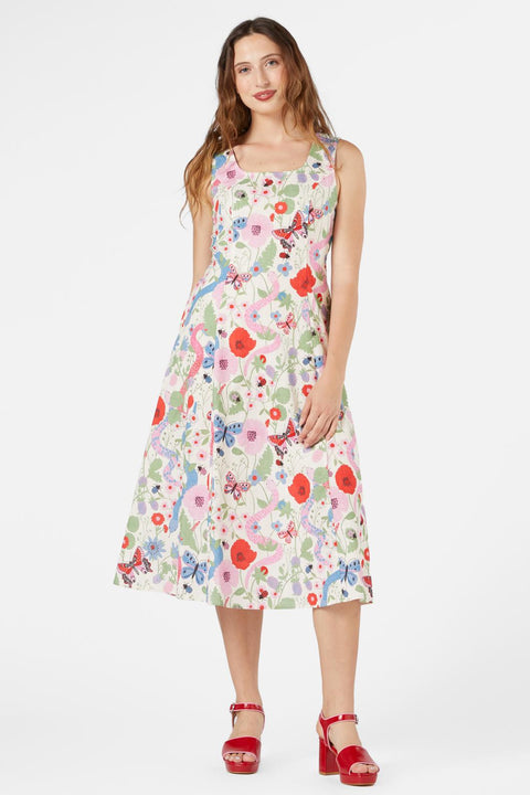Robe midi crème sans manches. Un magnifique imprimé célébrant l’année du serpent, avec des serpents fantaisie, des baies, des papillons, des insectes et des fleurs.