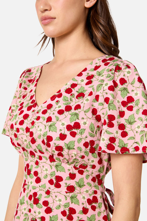 Plongez dans la douce nostalgie des années 90 avec la mini-robe framboise de Princess Highway. Ornée d’un imprimé ludique de framboises juteuses et de fleurs délicates sur un fond rose tendre, cette robe allie le charme vintage à une silhouette empire flatteuse. Avec ses manches courtes vaporeuses et ses boutons décoratifs, elle est idéale pour les promenades ensoleillées et les doux moments d’été.