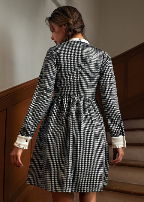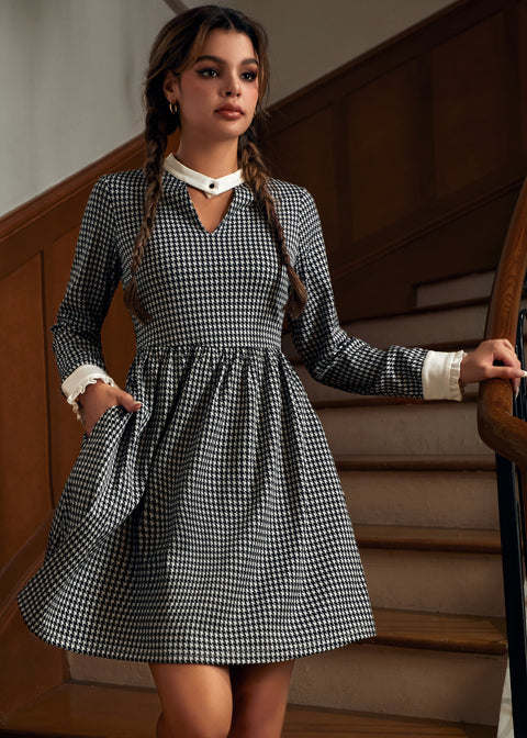 Affirmez votre style avec la robe pied-de-poule et clous de notre marque ModCloth. Cette robe cintrée et évasée est ornée d’un imprimé pied-de-poule noir et blanc intemporel, rehaussé d’une encolure en V et d’un col blanc contrastant avec boutons. Les poignets volantés ajoutent une touche ludique, tandis que les poches latérales discrètes offrent un côté pratique au quotidien. Portez-la avec des collants et des mocassins pour une tenue de bureau élégante, ou avec des talons et un rouge à lèvres rouge pour un look rétro instantanément glamour.
