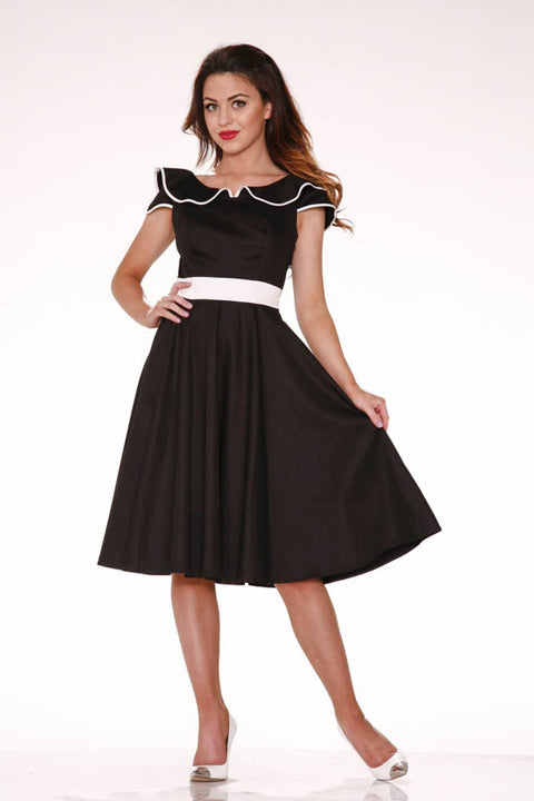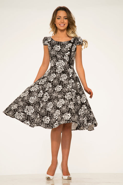Découvrez notre robe-chemise d’inspiration vintage signée ModCloth. Cette robe allie charme intemporel et confort optimal, avec une silhouette élégante et raffinée. Confectionnée dans un tissu léger, elle épouse les formes avec fluidité, évoquant le charme des années 40 et 50. Elle présente un col cranté arrondi, un passepoil délicat, une fermeture boutonnée sur toute la longueur, une ceinture amovible et des poches italiennes sur les hanches. Avec sa silhouette élégante et facile à porter et le charme supplémentaire d’un imprimé floral noir et rose, cette robe est un choix polyvalent et raffiné pour toutes les occasions, apportant une touche de sophistication d’inspiration vintage à votre garde-robe.
