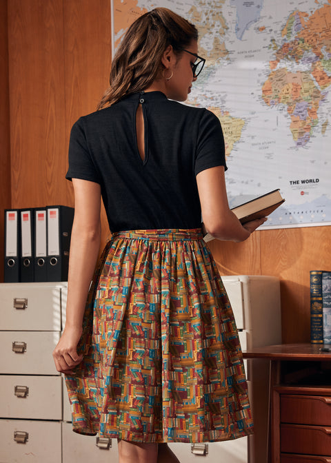 Affichez votre intelligence et votre style avec la robe Flair for Knowledge de notre marque ModCloth. Sa coupe cintrée et évasée met en valeur la silhouette grâce à un corsage contrasté flatteur, une jupe froncée dotée de poches pratiques et une ceinture à nouer à la taille. Avec son imprimé « Stacked Stories » aux allures de livres colorés, cette robe allie avec élégance charme académique et style vintage : parfaite pour les cours, les sorties entre amis ou pour aborder avec style votre prochaine étape de vie.