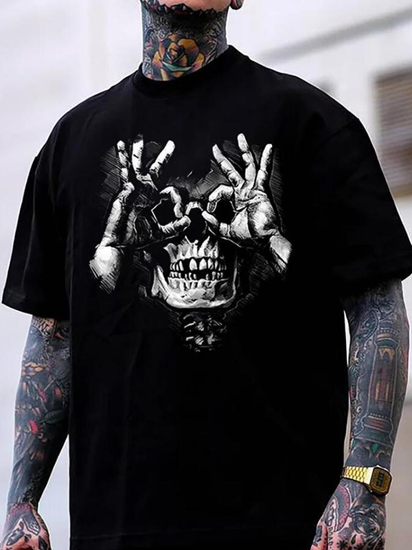 El patrón de la camiseta es sobre un esqueleto haciendo un par de OK signos sobre sus ojos. El gesto OK, comúnmente utilizado por los buceadores, significa "Estoy bien" o "¿Estás bien " cuando está bajo el agua. En la mayoría de los países de habla inglesa denota aprobación, acuerdo y que todo está bien o"bien". En otros contextos o culturas, gestos similares pueden tener diferentes significados o connotaciones, incluidos aquellos que son negativos, ofensivos, financieros, numéricos, devocionales, políticos o puramente linguistic. En la sociedad moderna, muchas personas también toman fotos con esta pose, que es muy popular.
