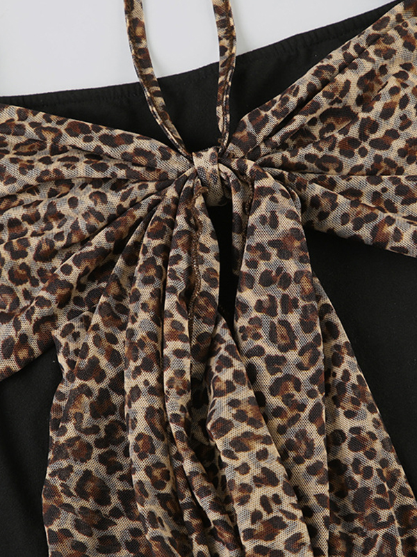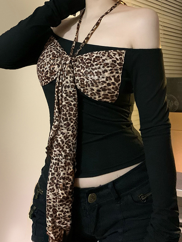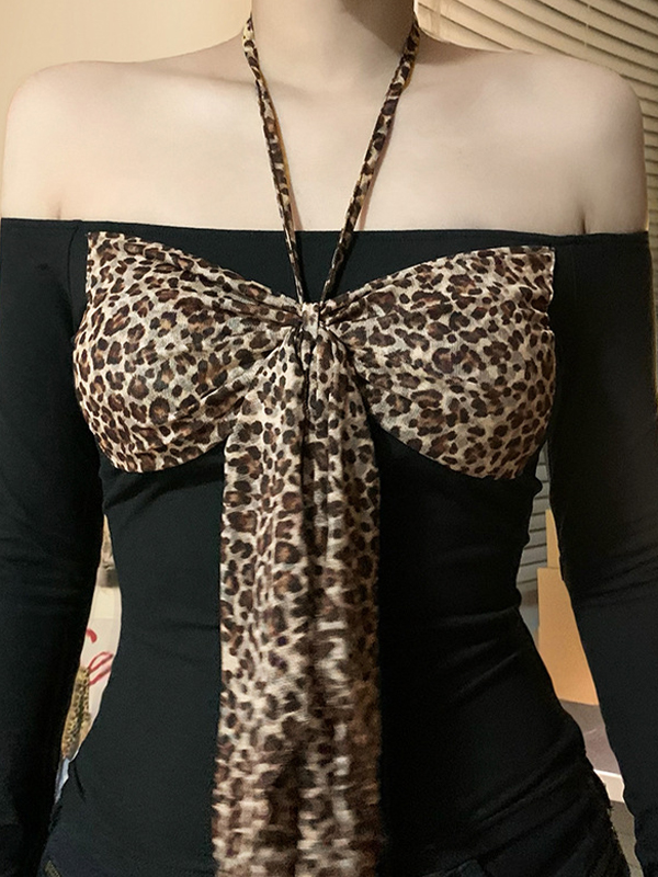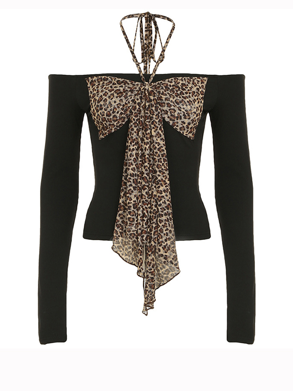 Camiseta de manga larga con cuello halter, lazo y estampado de leopardo