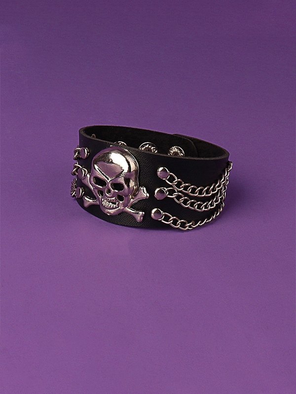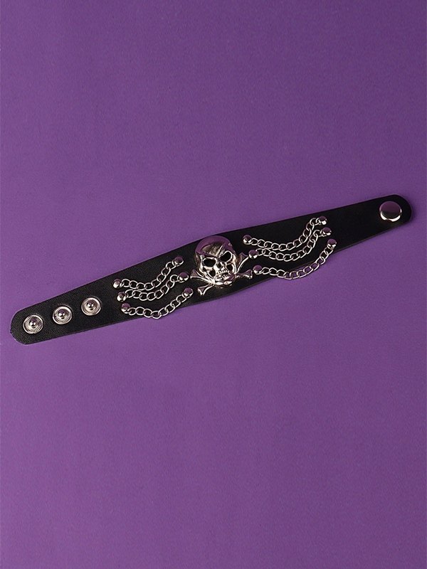 Pulsera de piel sintética gruesa con calavera adornada con cadena