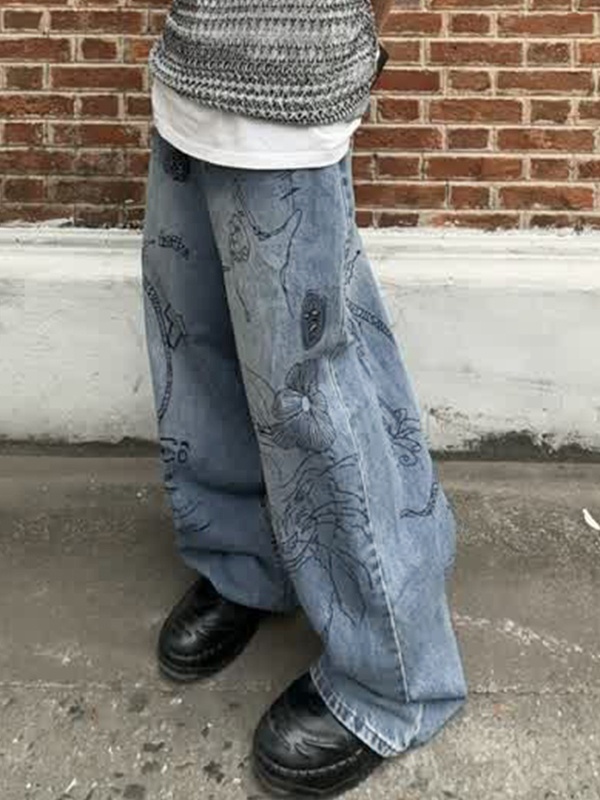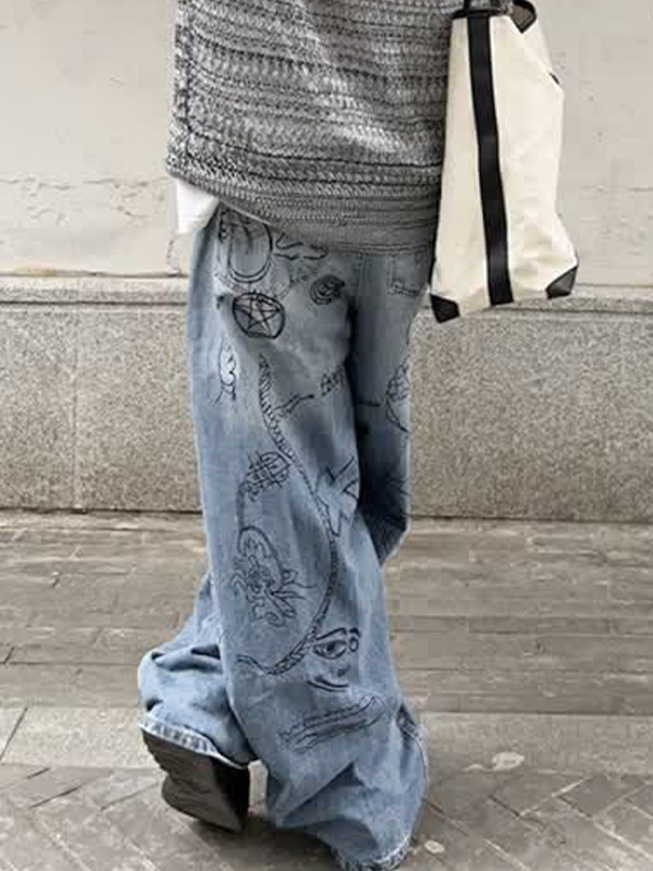 Diseño único y llamativo: la combinación del divertido patrón impreso pintado a mano y el ajuste holgado hace que estos jeans sean una adición única y llamativa a cualquier guardarropa, perfectos para aquellos que buscan hacer un declaración con sus opciones de moda.